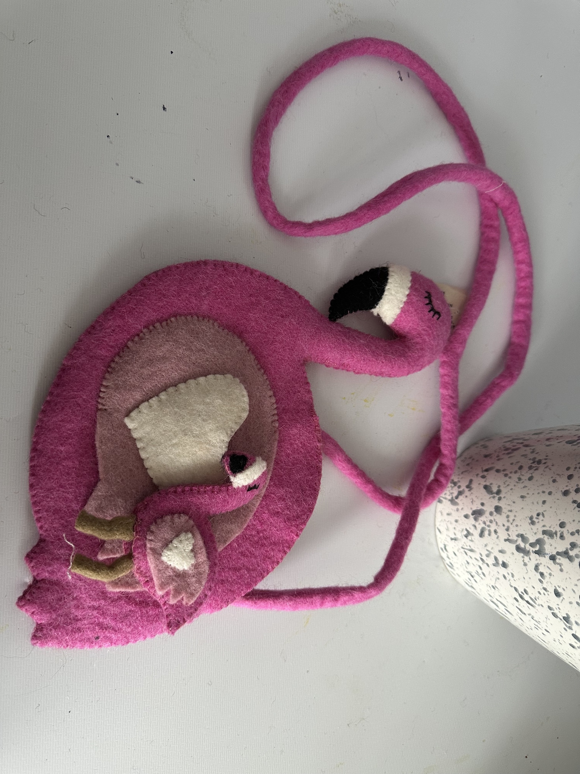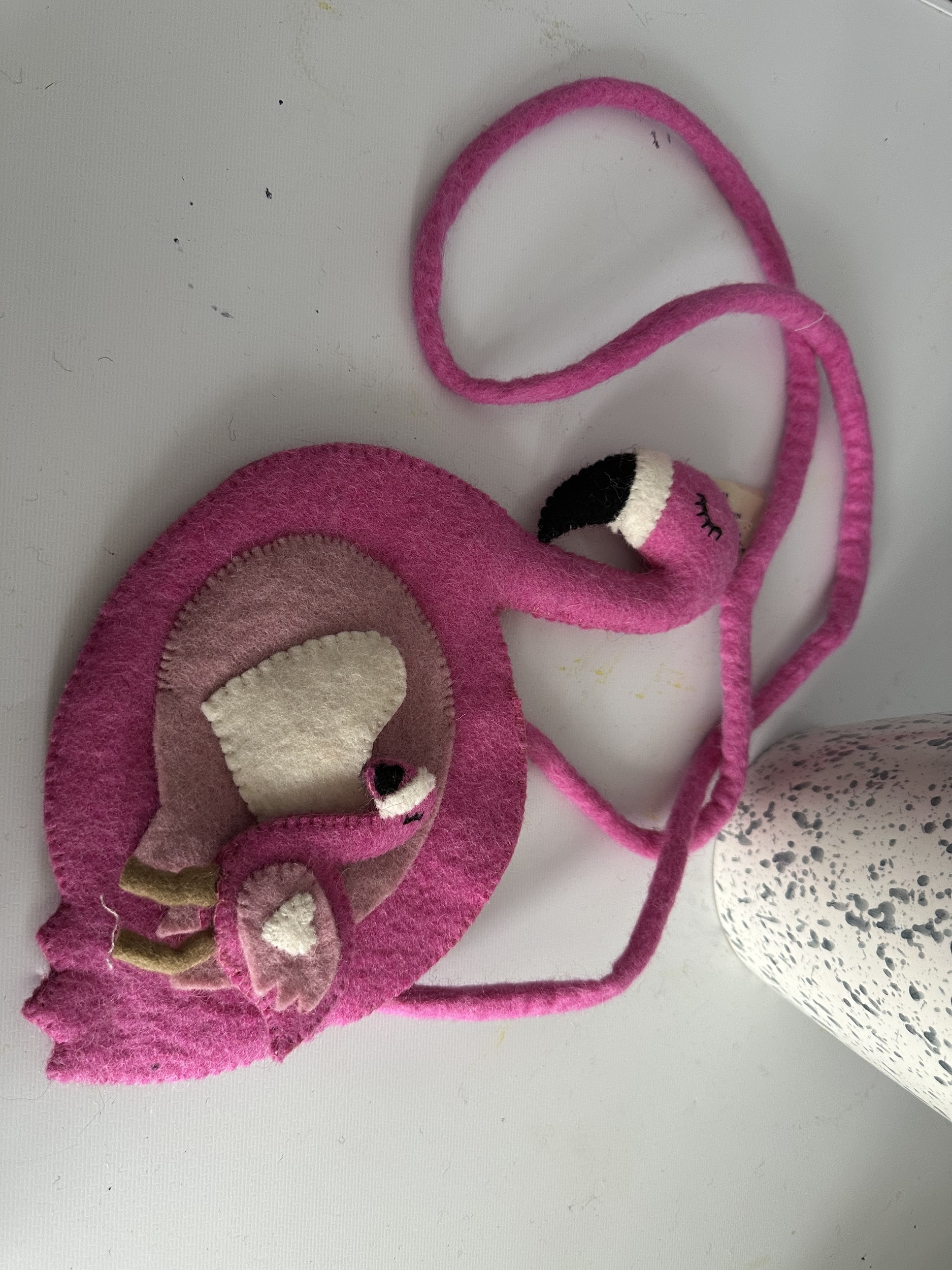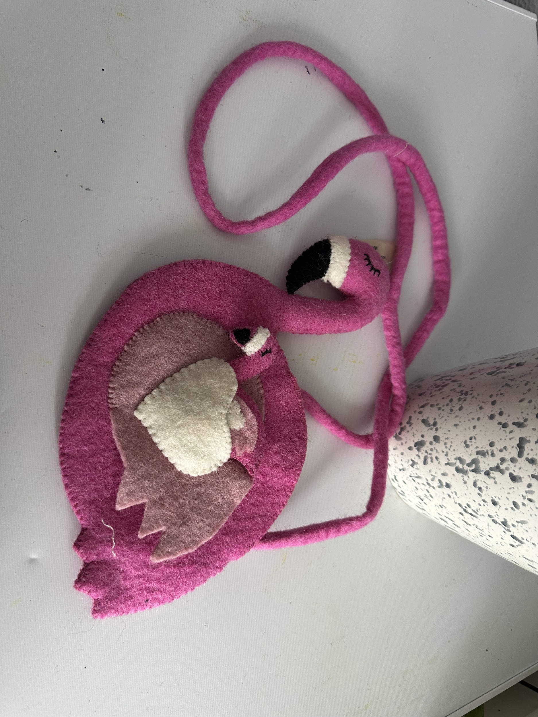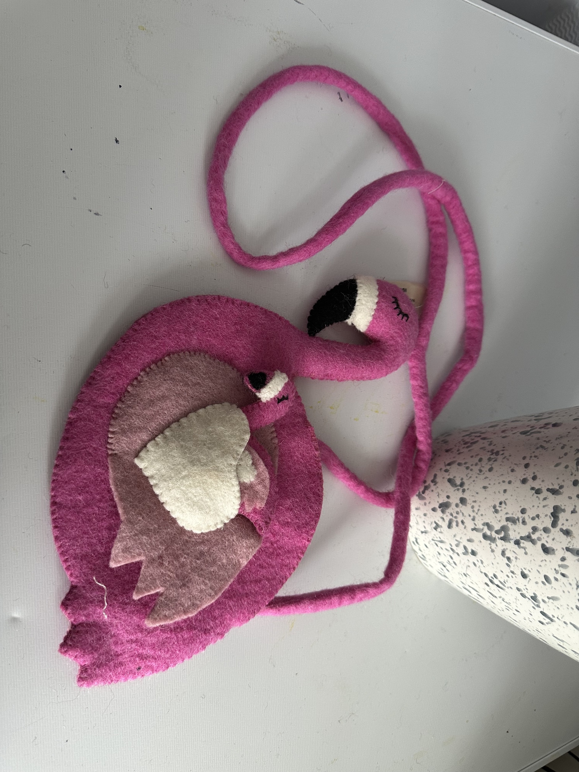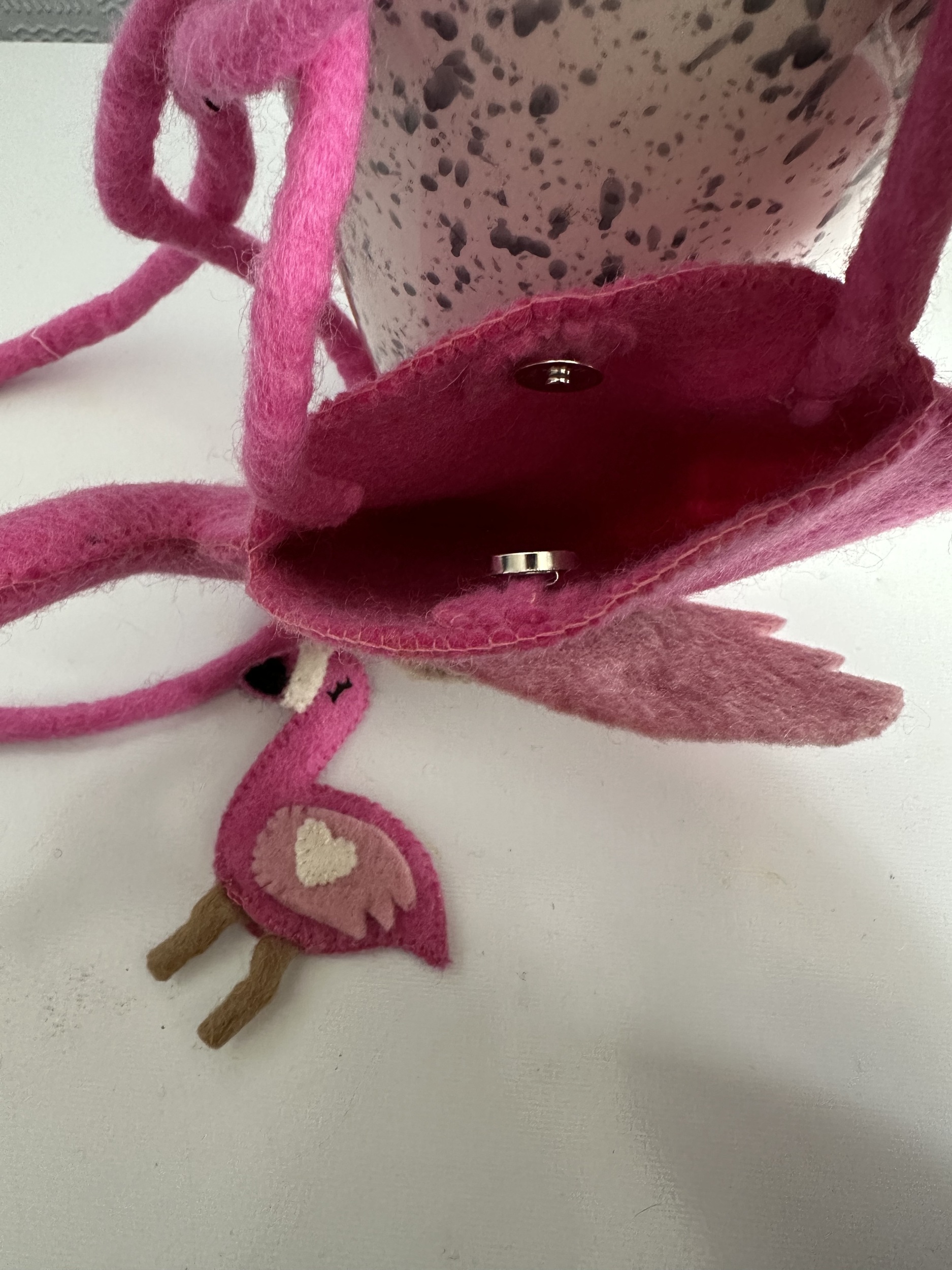This beautiful flamingo puppet bag is stunning . The colour the heart shape pocket to keep the baby is just all so cute and thoughtful . It’s been made to perfect