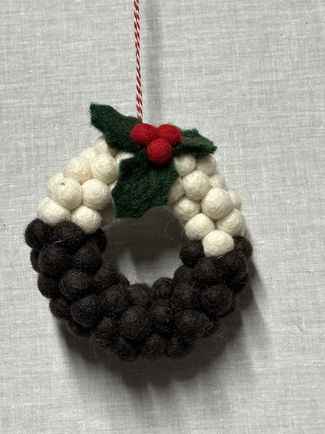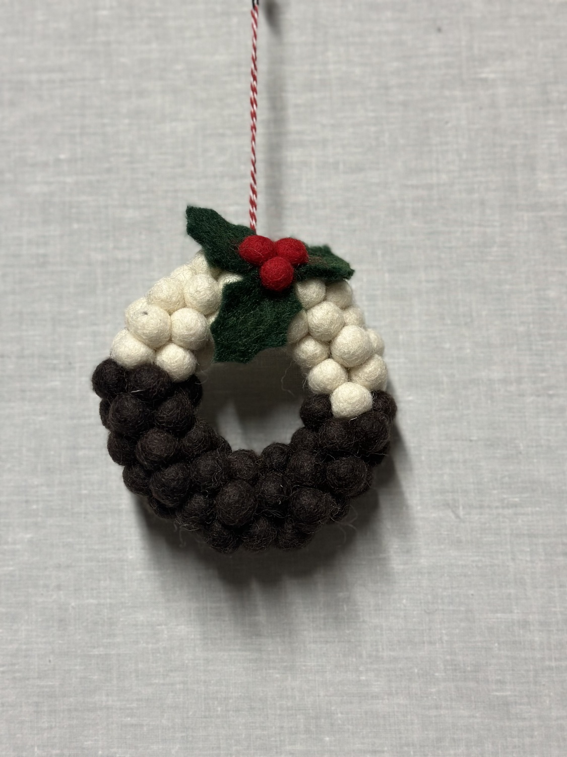 Pom Pom wreath in white and brown with green leaf and red Pom Pom .