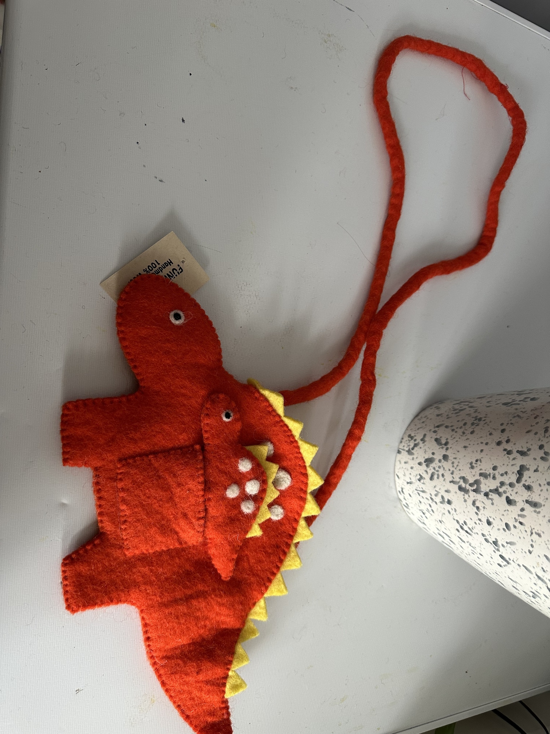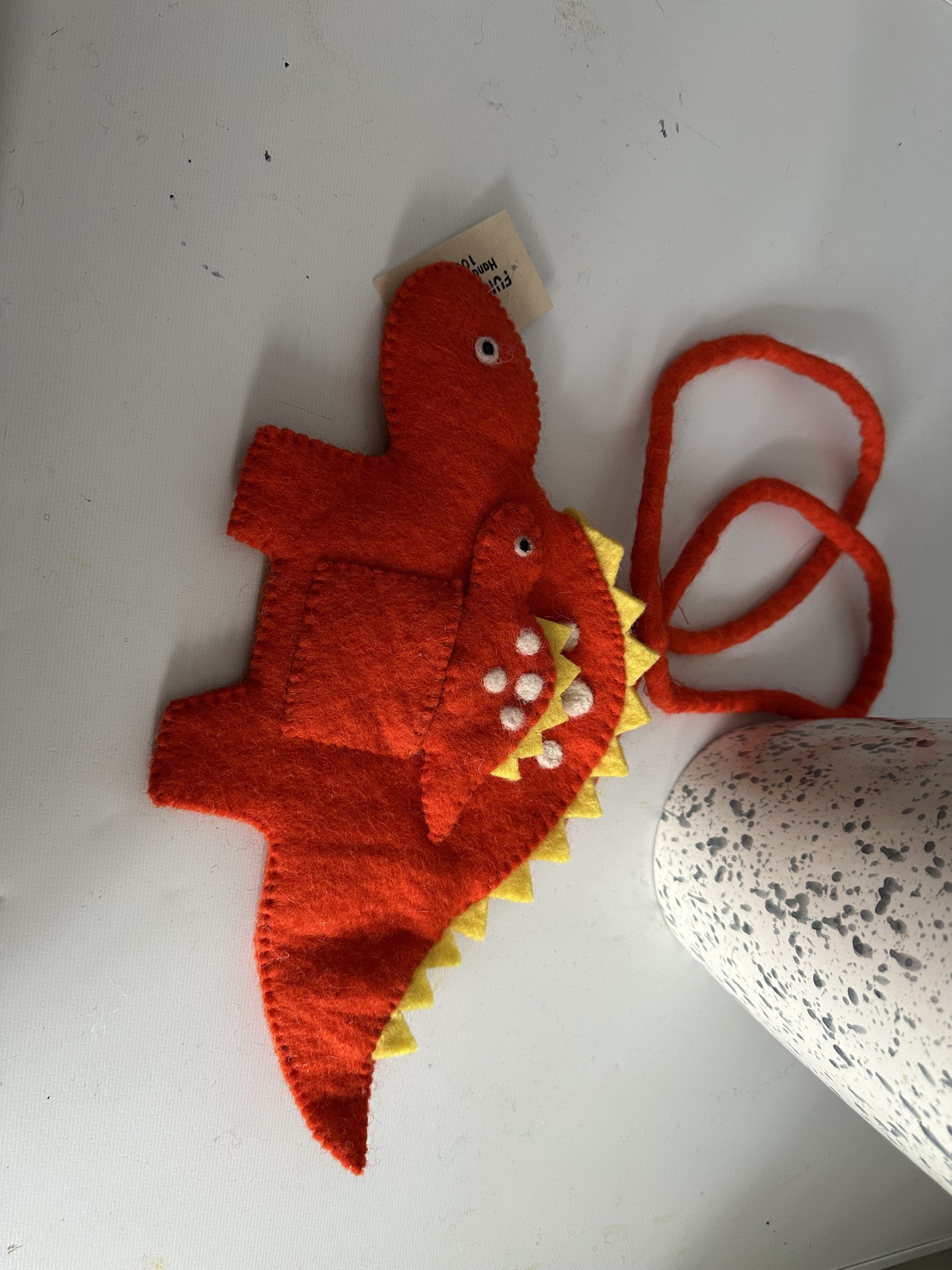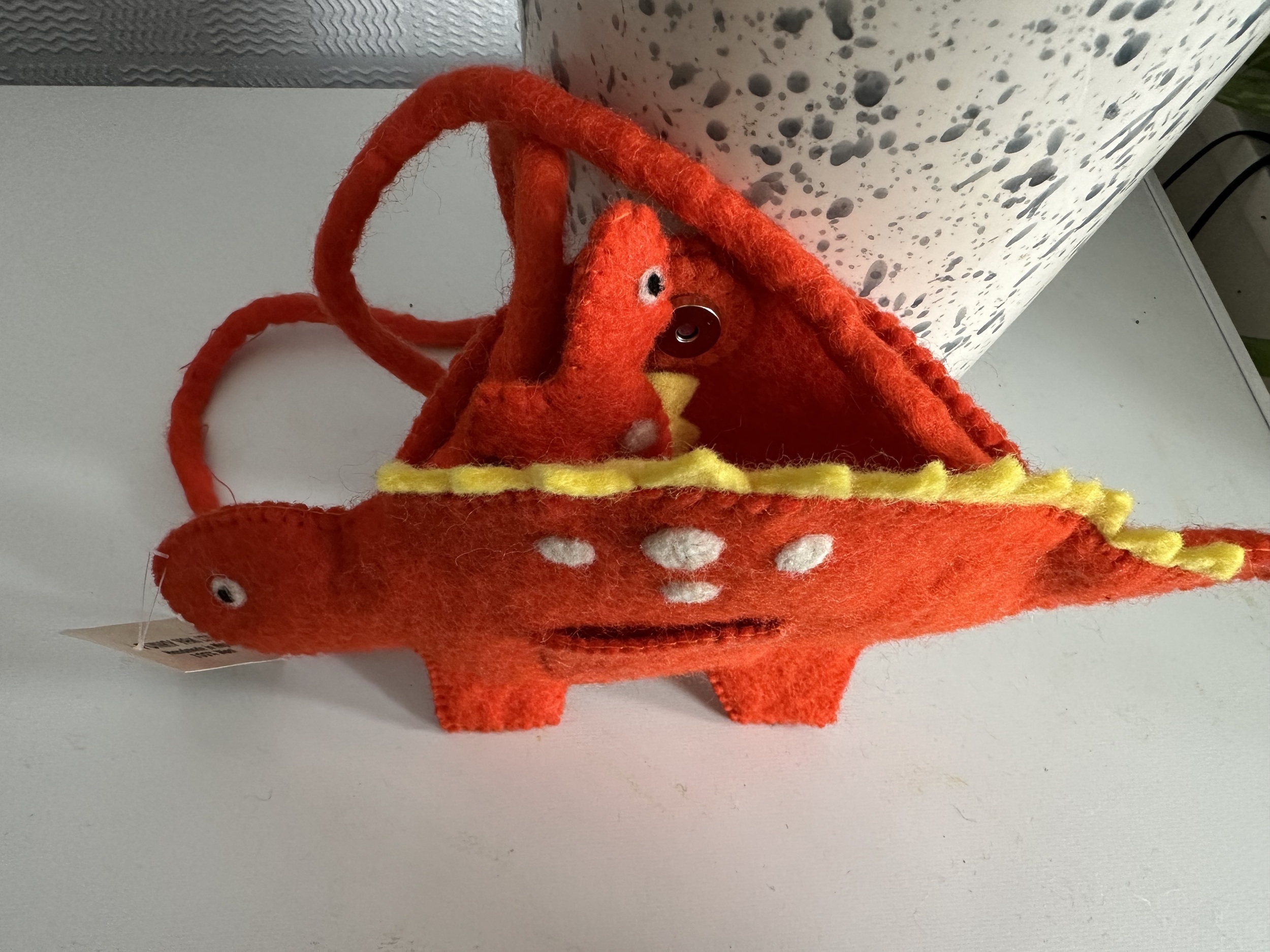 This cute dinosaur bag has its own baby puppet . It has a clip to secure the bag . The strape of the bag is almost 120 cm . We have duck , flamingo , owl , cow , sheep puppet bag too