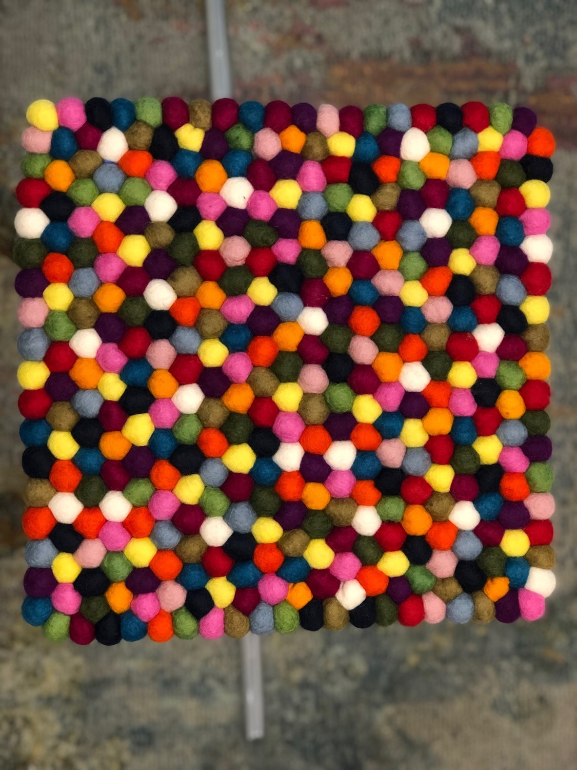 THIS BEAUTIFUL MULTI COLOUR SQUARE MAT/RUG IS 40 CM AND IS ALL STITCHED WITH NYLON MAKING IT EXTRA STRONG AND IT CAN BE HAND WASHED.THE BALL SIZE IS 2 CM. GOOD FOR PUTTING BIG POTS, USE ITFOR COFFEE TABLE , CAN BE USE AT MAT FOR BATHROOM OR MAT FOR SITTING AND USE AS A RUG FOR KIDS ROOM .