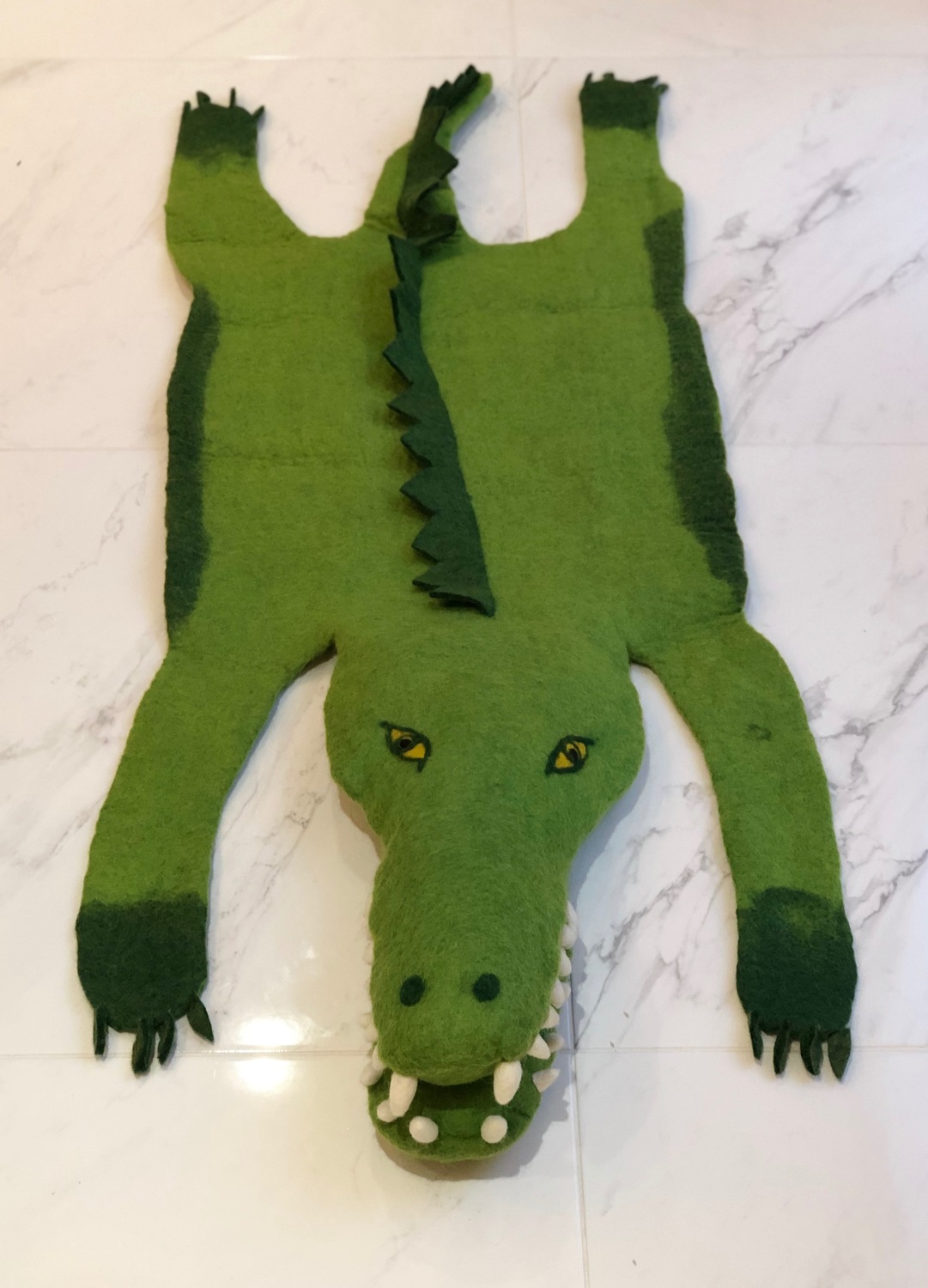 THIS BEAUTIFUL CROCODILE RUG IS ALL STITCHED WITH NYLON MAKING IT EXTRA STRONG AND IT CAN BE HAND WASHED.. CAN BE USED FOR COFFEE TABLE , CAN BE USE AT MAT FOR BATHROOM AND USE AS A RUG FOR KIDS ROOM . ITS MAKES A FUNKY RUG FOR KIDS BEDROOM GIVING A CHARACTER TO ROOM . SOFT TO SIT ON IT.
