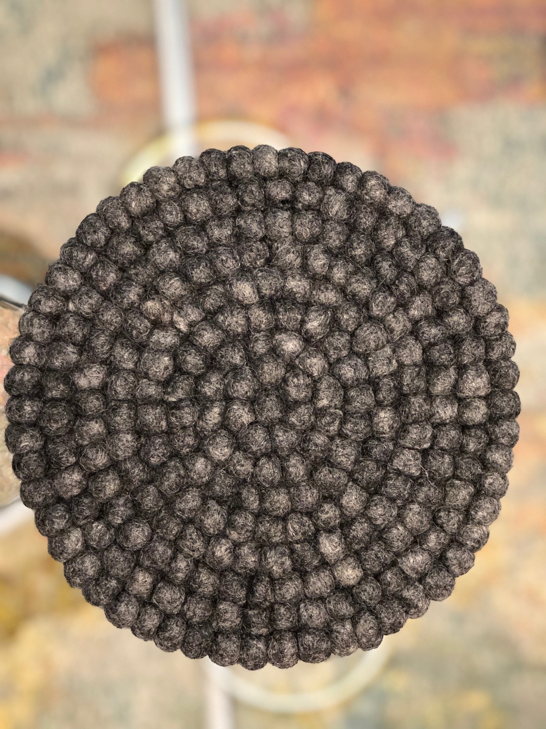 THIS BEAUTIFUL DARK GREY COLOUR HOTPAD/TRIVET IS 22 CM AND IS ALL STITCHED WITH NYLON MAKING IT EXTRA STRONG AND IT CAN BE HAND WASHED.THE BALL SIZE IS 1.5 CM.